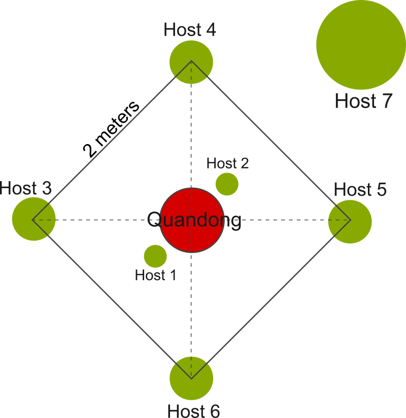Diagram: Example Planting Layout showing a central Quandong with multiple hosts for redundancy, distance varying from host based on size and age e.g. Saltbush > Acacia